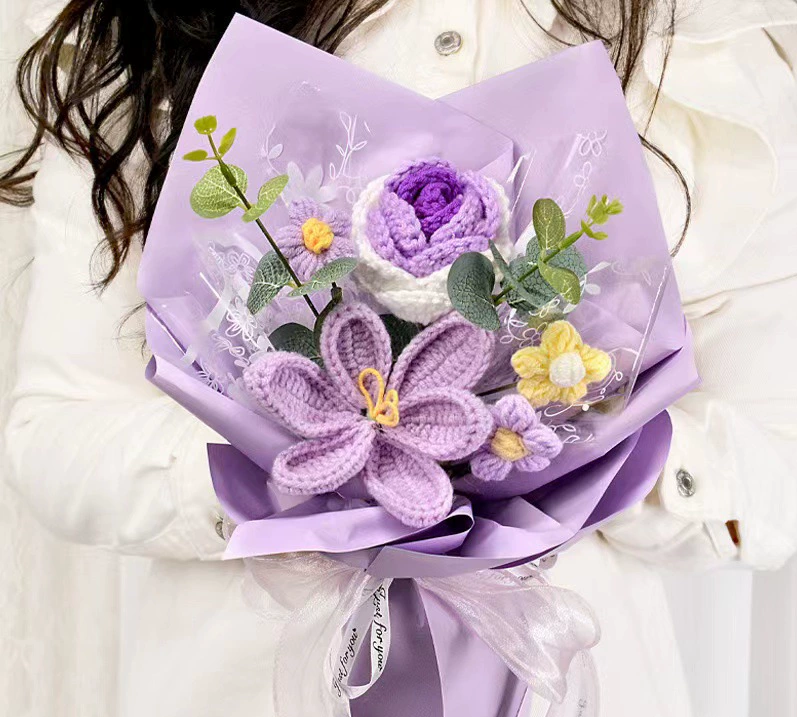 Our handmade purple crochet flower bouquets are the quintessential Valentine’s Day flower gift, radiating elegance and deep emotion. Purple, a color of luxury and romance, enhances the bouquet’s symbolism of admiration and love. As a custom crochet flower factory, we offer these beautiful bouquets in bulk, each crafted with meticulous care and available in multiple styles. Besides, we support single flowers delivery for you to custom the bouquet based on your prefers. This crochet bouquet is perfect to convert your deepest feelings into someone special on Valentine’s Day. Contact us for more details and options.